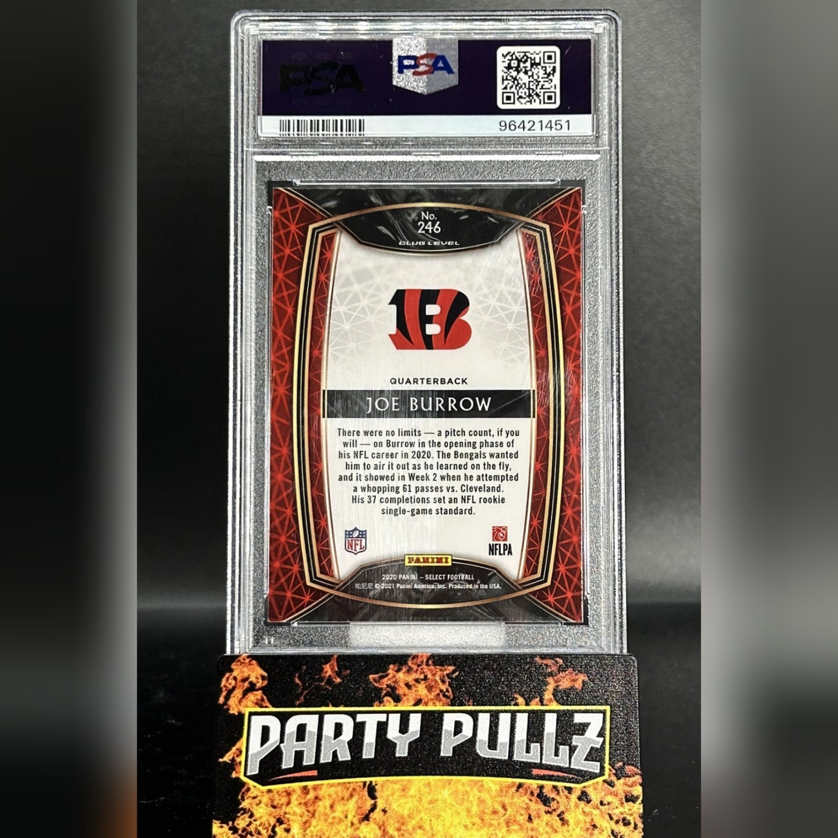 This Is A Graded 2020 Panini Select Football Card Featuring Joe Burrow, The Quarterback For The Cincinnati Bengals. The Card Is A Rookie Card (#246) And Has Been Graded A "Gem Mint 10" by (PSA), A Company That Authenticates & Grades Trading Cards.