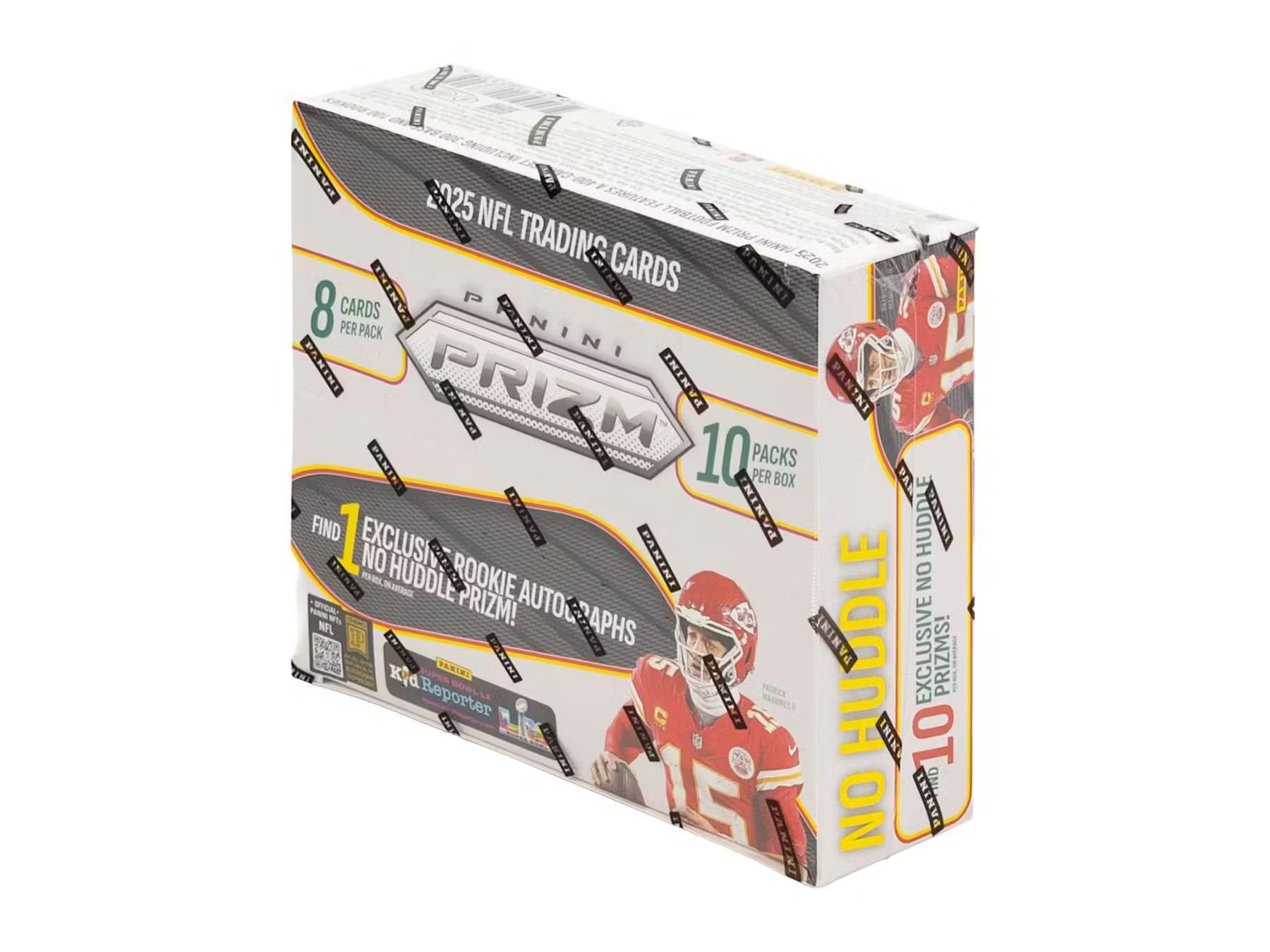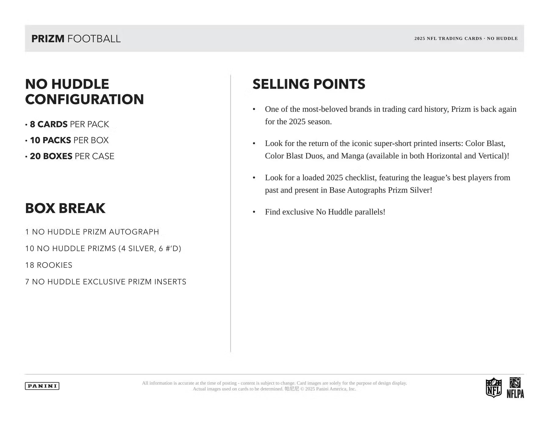 Each Box contains 1 No Huddle Prizm Autograph, 10 No Huddle Prizms (4 Silver, 6 #'d), 18 Rookies, and 7 No Huddle Exclusive Inserts, on average!