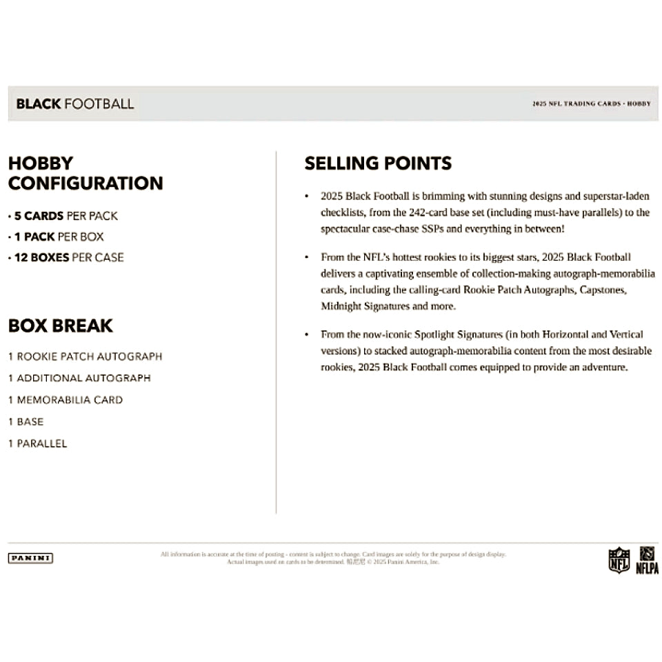 From The NFL's Hottest Rookies To Its Biggest Stars, 2025 Black Football Delivers A Captivating Ensemble Of Collection-Making Autograph-Memorabilia Cards, Including The Calling-Card Rookie Patch Autographs, Capstones, Midnight Signatures & More.