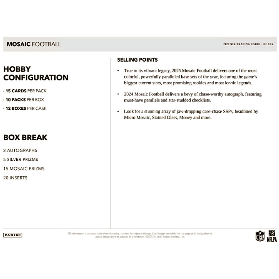 True To Its Vibrant Legacy, 2025 Mosaic Football Delivers One Of The Most Colorful, Powerfully Paralleled Base Sets Of The Year, Featuring The Game's Biggest Current Stars, Most Promising Rookies & Most Iconic Legends.